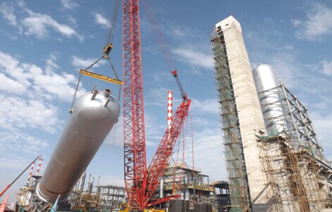 2014年7月15日早上8點整,在陜西東鑫垣勝幫項目現(xiàn)場,由大連金州重型機械有限公司承建制造的焦炭塔進行吊裝就位,焦炭塔高位32米,直徑6.1米,總重量為185T,采用了400T的履帶吊作為主吊,300t汽車吊作為溜尾吊車進行吊裝,經(jīng)過近2個小時的工作,焦炭塔順利就位。焦炭塔平穩(wěn)起吊 塔體基本吊起,這時重量的90%由400T履帶吊承擔(dān) 履帶吊進行180度轉(zhuǎn)身焦炭塔基本就位
