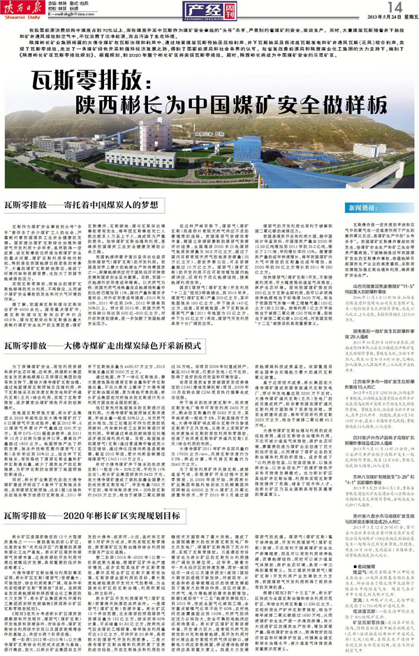 瓦斯零排放:陜西彬長為中國煤礦安全做樣板陜西日報:2013年5月24日第14版 鏈接地址:http://esb.sxdaily.com.cn/shtml/sxrb/20130524/v14.shtml瓦斯零排放:陜西彬長為中國煤礦安全做樣板在我國能源消費結構中煤炭占到70%以上,而在煤炭開采中瓦斯作為煤礦安全事故的“頭號”殺手,嚴重制約著煤礦的安全、高效生產(chǎn)。同時,大量煤層瓦斯隨著井下抽放和礦井通風排放到空氣中,不…