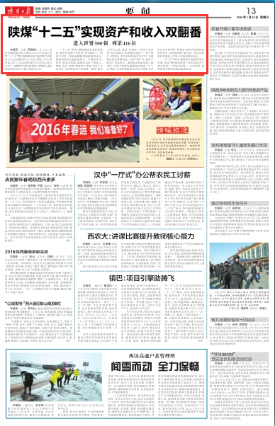 陜西日報:2016年1月24日 13版 陜煤“十二五”實現(xiàn)資產(chǎn)和收入雙翻番 進(jìn)入世界500強(qiáng) 列第416位 本報訊(記者 郭曉斌)1月21日,記者從陜西煤業(yè)化工集團(tuán)2016年工作會上獲悉,“十二五”期間,陜西煤業(yè)化工集團(tuán)資產(chǎn)總額由1942億元提升到4243億元,增長118%;銷售收入由711億元增加到1910億元,增長169%。實現(xiàn)資產(chǎn)總額、銷售收入雙翻番,成功躋身世界企業(yè)500強(qiáng),位列第416位。 …