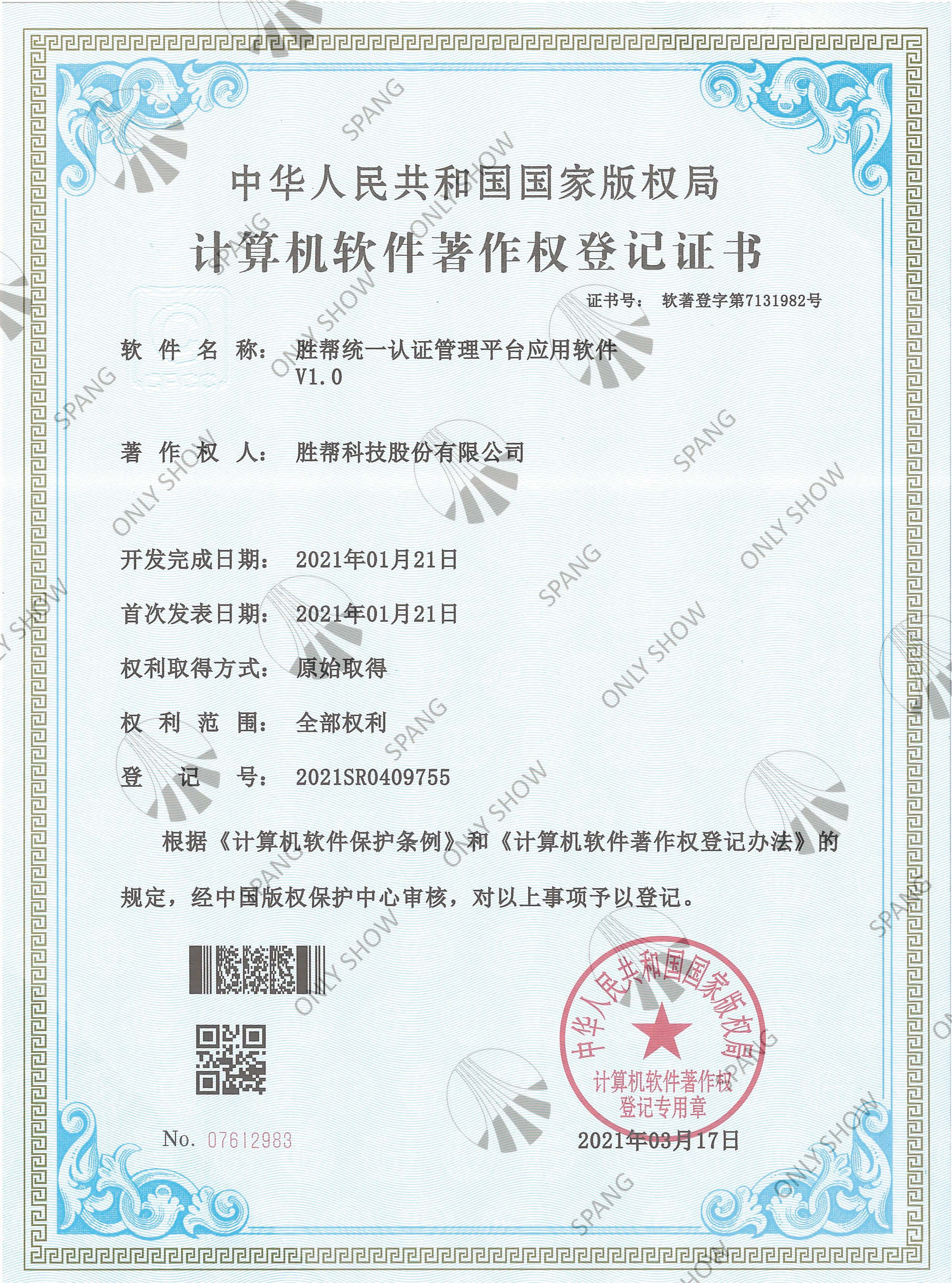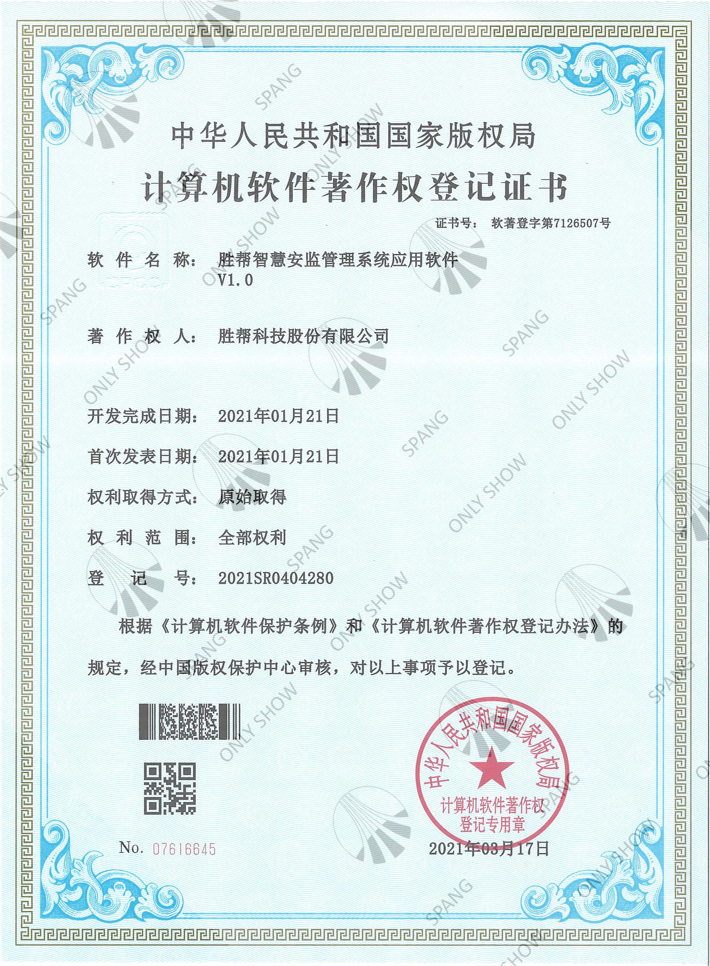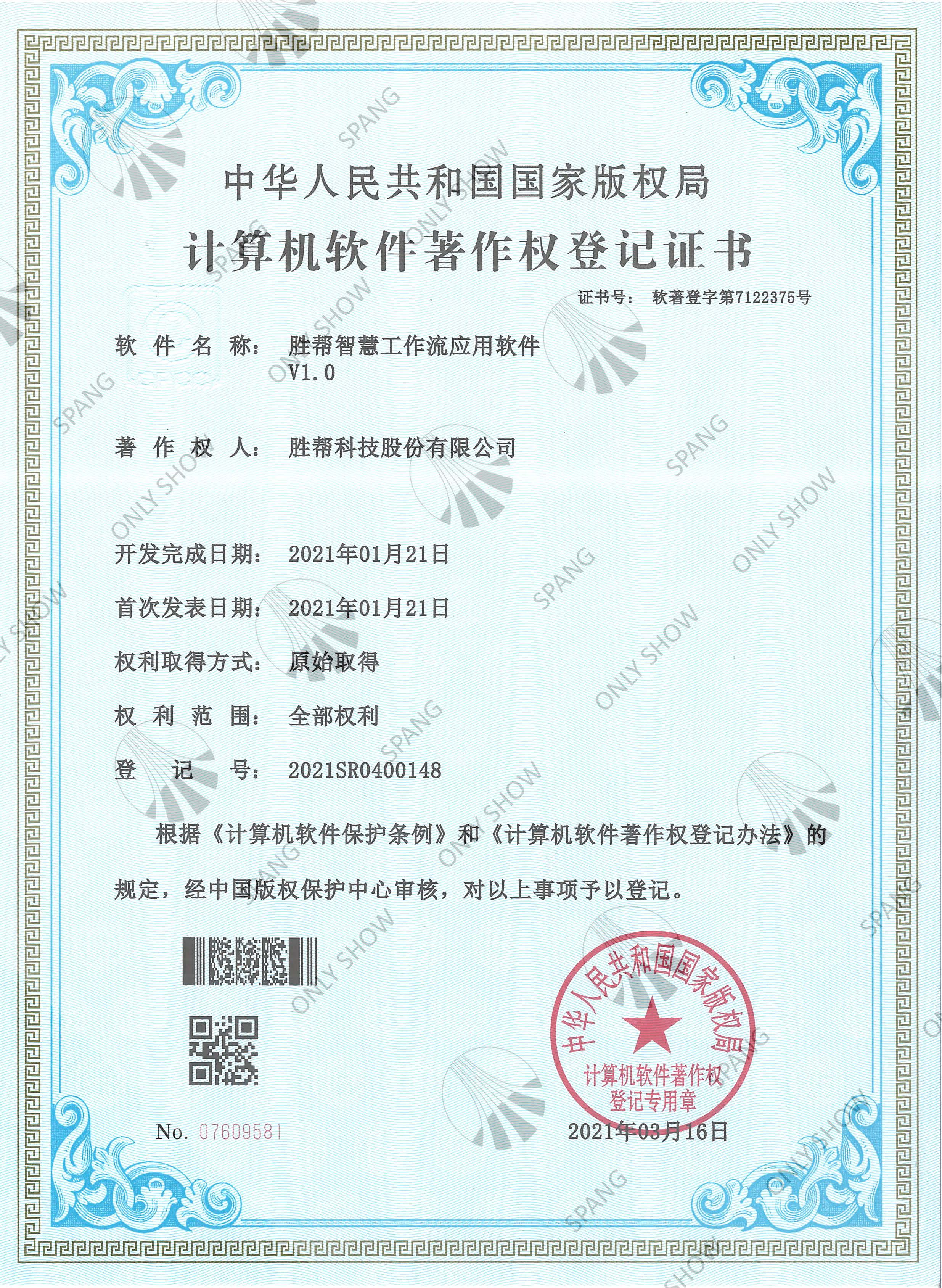 2021年3月16日,經(jīng)中國(guó)版權(quán)保護(hù)中心審核,勝幫科技正式獲得《智慧安監(jiān)管理系統(tǒng)應(yīng)用軟件》、《統(tǒng)一認(rèn)證管理平臺(tái)應(yīng)用軟件》、《智慧工作流應(yīng)用軟件》三項(xiàng)計(jì)算機(jī)軟件著作權(quán)登記證書(shū)。