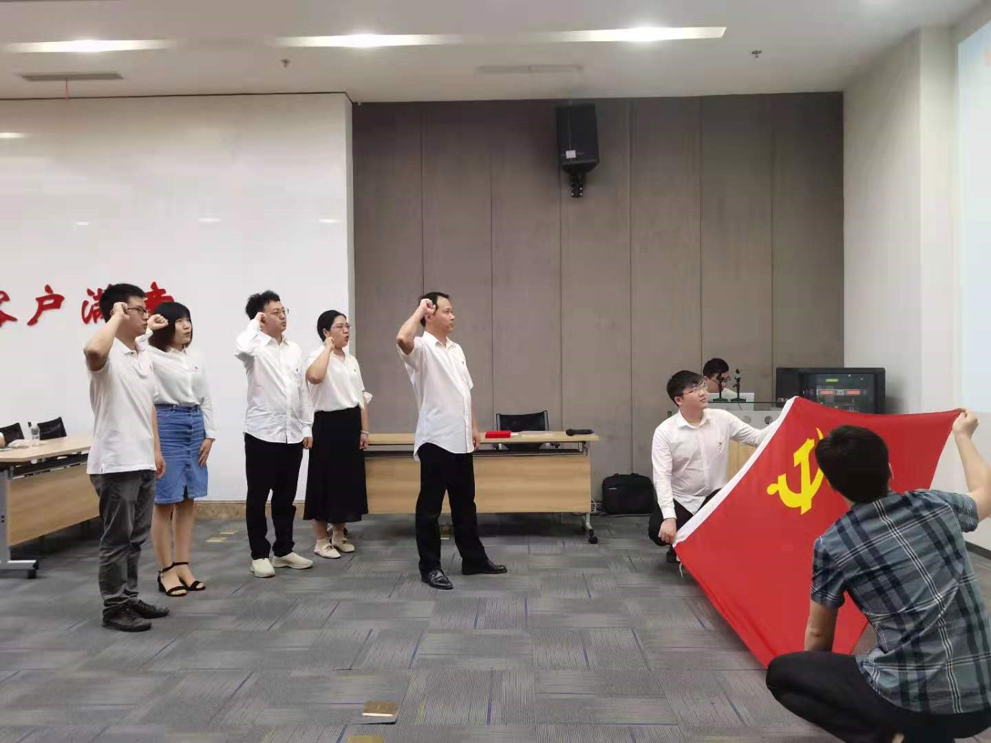 在會上,公司黨委組織新黨員在黨旗下莊嚴宣誓,全體黨員一起重溫入黨誓詞,回首建黨百年的崢嶸歲月。