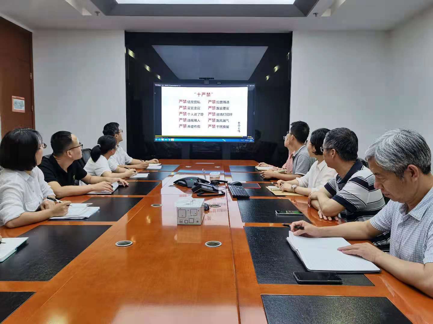 為進(jìn)一步嚴(yán)肅換屆紀(jì)律,筑牢干部廉潔自律的思想道德防線。8月16日,勝幫科技黨委組織公司領(lǐng)導(dǎo)班子成員、中層副職以上黨員干部集中觀看了由中共中央組織部干部監(jiān)督局等聯(lián)合制作的專題警示教育片《警鐘長鳴—嚴(yán)肅換屆紀(jì)律教育警示錄》,并發(fā)放了《“十嚴(yán)禁”換屆紀(jì)律要求》提醒卡。