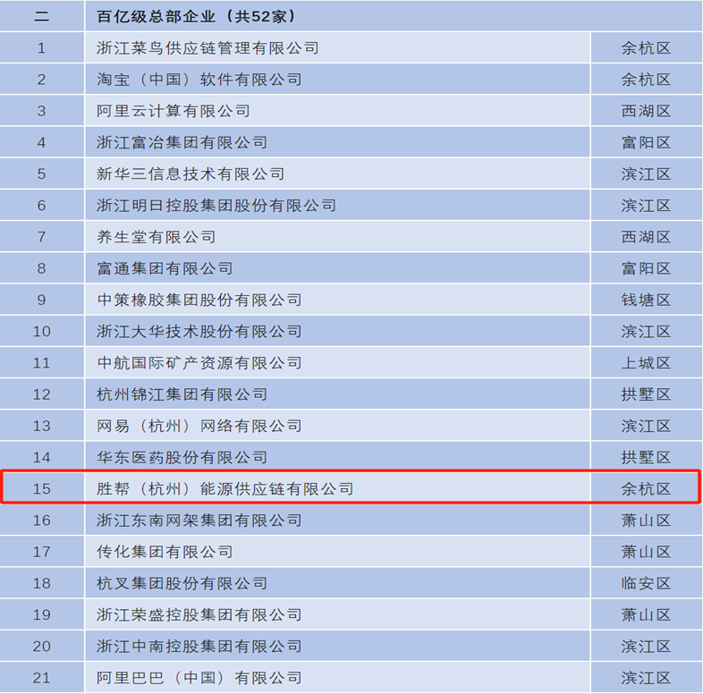 為扶持、培育和引進(jìn)總部企業(yè),積極打造全國(guó)一流總部經(jīng)濟(jì)中心,杭州市首次組織總部企業(yè)認(rèn)定工作,認(rèn)定阿里巴巴等468家企業(yè)為2023年度杭州市總部企業(yè),包括民企總部394家、央企總部18家、外企總部56家。其中,根據(jù)企業(yè)營(yíng)業(yè)收入規(guī)模,評(píng)出全市百億以上總部企業(yè)58家(余杭區(qū)4家),勝幫(杭州)能源供應(yīng)鏈有限公司入選,享受杭州總部經(jīng)濟(jì)扶持政策的第一波紅利。