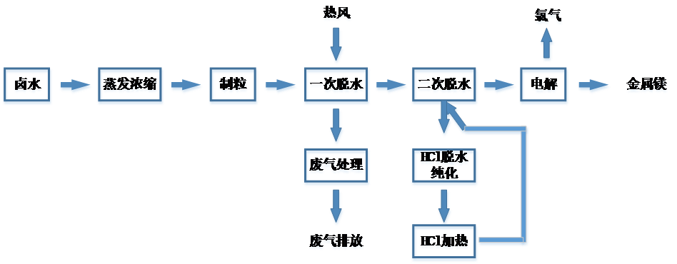 該法是將含33 %左右的MgCl2鹵水先凈化除雜,再蒸發(fā)濃縮噴灑造粒,制成含水約48 %的固體顆粒,將此顆粒送一次脫水沸騰床中用熱風(fēng)進(jìn)行脫水,得到含水約23 ~ 25 %的一次脫水顆粒。為抑制氯化鎂水解,再在二次脫水沸騰床中用熱HCl氣體進(jìn)行完全脫水,制得無水氯化鎂顆粒料,HCl尾氣在HCl處理系統(tǒng)中脫水純化后循環(huán)使用,無水氯化鎂顆粒料加入電解槽中,電解制得金屬鎂和氯氣,具體工藝見下圖。