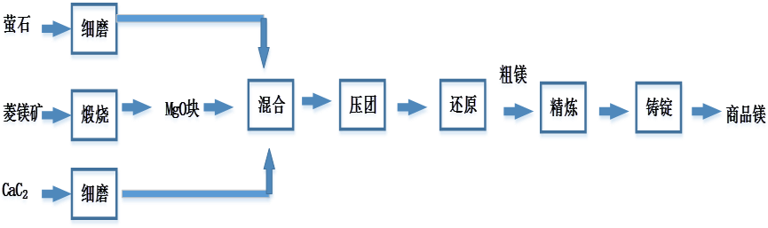 該方法由加拿大科學(xué)家L.M.Pidgeon首先提出。工藝是:將硅鐵(Si > 75 %)和煅燒后的白云石按一定配比混合、磨細(xì)、壓團(tuán),裝入耐熱合金鋼制的還原罐底端密封,在反應(yīng)溫度為1150 ~ 1200 ℃、真空為1.3 ~ 13 Pa的條件下還原出鎂蒸氣,鎂蒸氣冷凝于還原罐另一端,結(jié)晶為粗鎂,再經(jīng)過精煉澆鑄得到鎂錠。反應(yīng)方程式如下:2(MgO·CaO)(s) + Si(Fe)(s) = 2Mg(g) + 2CaO·Si02(s)。其工藝流程如下圖,還原周期為8 ~ l0 h。