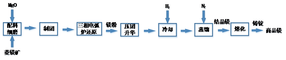 該法是以木炭、煤、焦炭等碳質(zhì)材料作還原劑,在高溫條件下從氧化鎂中還原制取金屬鎂的方法,其反應(yīng)方程式如下:MgO(s) + C(s) = Mg(g) + CO(g)。該法于1938年由奧地利F.Hansgirg提出,團(tuán)塊爐料在1800 ℃或更高溫度的三相電弧爐中進(jìn)行反應(yīng),還原出Mg蒸氣和CO氣體,再混入大量中性氣體(如氫氣等)或油,使產(chǎn)物溫度由1900 ~ 2000 ℃迅速降至250 ℃以下,得到冷凝鎂粉,從而實現(xiàn)氣體分離,其工藝流程如下圖。
