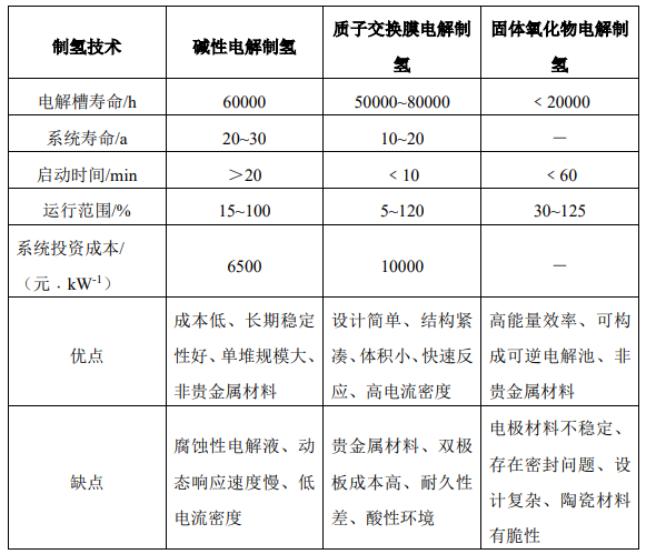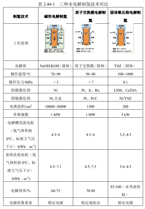 根據電解液的不同,當前被認為可大規(guī)模推廣的電解制氫技術主要分為3種:堿性電解、質子交換膜電解和固體氧化物電解。表2.4-1是三種水電解制氫技術對比,表2.4-2為電解水和其它工業(yè)制氫技術對比。
