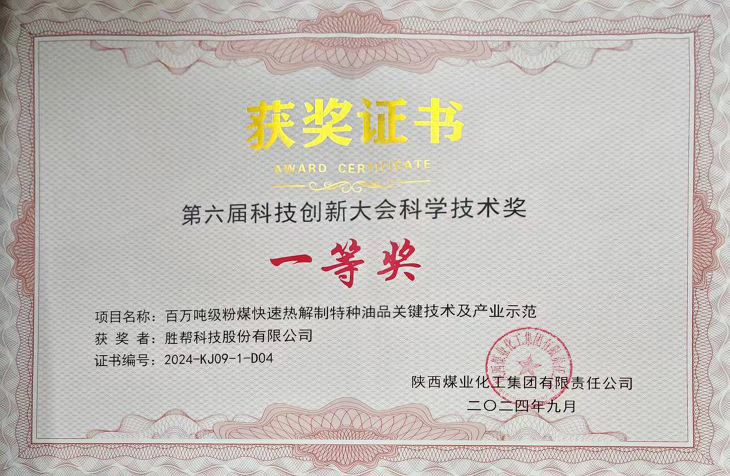 2024年9月2日,陜煤集團(tuán)召開第六屆科技創(chuàng)新大會(huì)。勝幫科技股份有限公司和榆林化學(xué)等單位憑借《百萬噸級(jí)粉煤快速熱解制特種油品關(guān)鍵技術(shù)及產(chǎn)業(yè)示范》項(xiàng)目獲得陜煤集團(tuán)2018-2023年科學(xué)技術(shù)獎(jiǎng)一等獎(jiǎng)。這一輝煌成績(jī),是對(duì)勝幫科技股份有限公司全體科研人員長(zhǎng)久以來辛勤耕耘的高度認(rèn)可與褒獎(jiǎng)。
