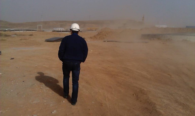 早上來到工地時,正好遇到每天準時到來的沙塵暴,錢經(jīng)理不畏-6℃的嚴寒,風(fēng)沙中行走。