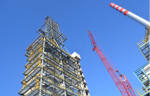 高聳入云的焦炭塔框架,恨比天低。旁邊是項(xiàng)目上的大力士:三一重工的400噸級(jí)吊車(chē),主要負(fù)責(zé)重型和高聳結(jié)構(gòu)的吊裝,如焦炭塔、焦炭塔框架、分餾塔等。