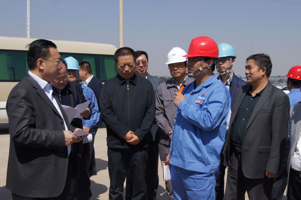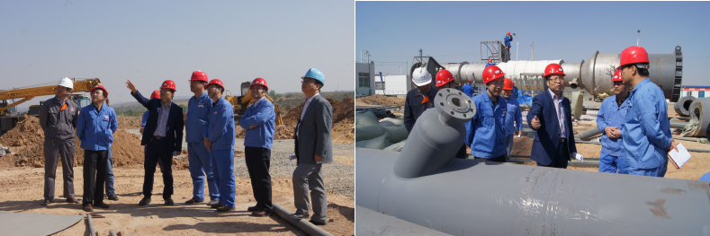 2015 年4 月27 日上午11 時(shí),陜西省榆林市人大常委會(huì)主任、市黨組書記胡志強(qiáng),榆陽區(qū)區(qū)委書記苗豐,陜北礦業(yè)董事長李強(qiáng)林等一行來我乾元項(xiàng)目部進(jìn)行視察。陜北乾元公司副總衛(wèi)東向市領(lǐng)導(dǎo)詳細(xì)介紹了5 萬噸/年氣固熱載體粉煤熱解工業(yè)試驗(yàn)項(xiàng)目的技術(shù)概況、工藝流程、裝置組成及施工進(jìn)度。