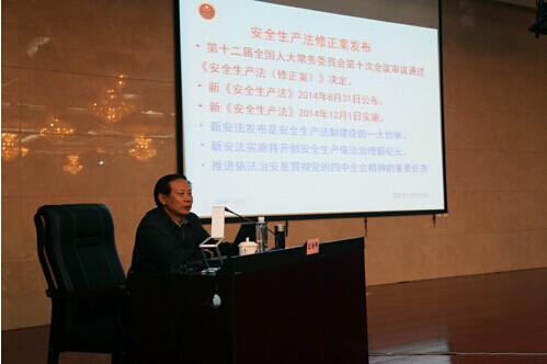 講座中,支同祥從新《安全生產法》修改背景、思路、原則、要求、經過等五個方面進行講解,重點對新《安全生產法》的修法要點、涉及到的六個重點變化、十二個增加、十個完善、十個創(chuàng)新作了詳細的分析和說明。他指出,新《安全生產法》牢固樹立以人為本、生命至上的理念,堅守發(fā)展決不能以犧牲人的生命為代價這條“紅線”,建立生產經營單位負責、職工參與、政府監(jiān)管、行業(yè)自律、社會監(jiān)督的機制,進一步明確了各方安全生產職責。對于建立健全“黨政同責、一崗雙責、齊抓共管”的安全生產責任體系,進一步提升安全生產工作的重要地位、強化生產經營單位主體責任、加強政府監(jiān)管、強化責任追究,預防和減少生產安全事故,保障人民群眾生命和財產安全,促進經濟社會持續(xù)健康發(fā)展具有重大意義。支同祥強調,新《安全生產法》的頒布實施是安全生產的一件大事,學習實施新《安全生產法》是貫徹黨的四中全會精神的重要任務。今后對于新《安全生產法》的落實應用,一要深入學習理解。企業(yè)各級領導帶頭學,安全管理人員帶頭學,帶動車間、班組、各類操作人員全面學習,深入理解,做到知法、懂法、守法;二要大力宣傳貫徹。企業(yè)各級領導要高度重視,提高對新安全法宣傳貫徹重要性的認識,加大工作力度,廣泛宣傳,掀起新高潮,進一步營造安全法治氛圍;三要全面推進實施,各類企業(yè)要采取各種措施,推進新《安全生產法》的全面實施,強化企業(yè)主體責任,強化安全預防,增強安全保障能力,做到依法依規(guī)生產,杜絕違法違規(guī),防范各類事故,推進企業(yè)安全生產形勢的持續(xù)穩(wěn)定好轉。